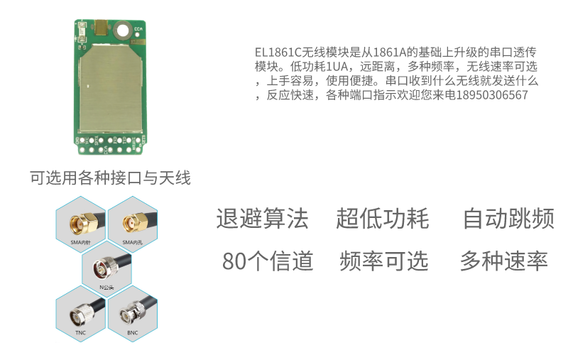 EL-1861C系列是一款低成本,高性能的FSK無線透明數(shù)據(jù)收發(fā)模塊。它采用的是SLIABS 的SI4463無線方案,用戶只要通過串口可以簡(jiǎn)單方便的控制無線的收發(fā),并通過串口可進(jìn)行頻率、功率、無線通訊速率,可修改串口控制速率適用于任何工業(yè)控制使用。通訊距離在空曠地實(shí)測(cè)可達(dá)3.5KM.具有尺寸小,功率大,靈敏度高,傳輸距離遠(yuǎn),通訊速率高,內(nèi)部自動(dòng)完成通訊協(xié)議轉(zhuǎn)換和數(shù)據(jù)收發(fā)控制等特點(diǎn)。模塊提供UART 串行數(shù)據(jù)接口,只需提供串行數(shù)據(jù)即可輕松實(shí)現(xiàn)無線數(shù)據(jù)傳輸功能。用戶還可以根據(jù)自己的需求靈活配置摸塊的串行速率,工作頻率,發(fā)射功率,通訊數(shù)率,信道選擇等參數(shù)。EL-1861A系列模塊可廣泛應(yīng)用于各類無線數(shù)據(jù)傳輸領(lǐng)域,是設(shè)計(jì)無線數(shù)據(jù)傳輸產(chǎn)品的理想選擇。